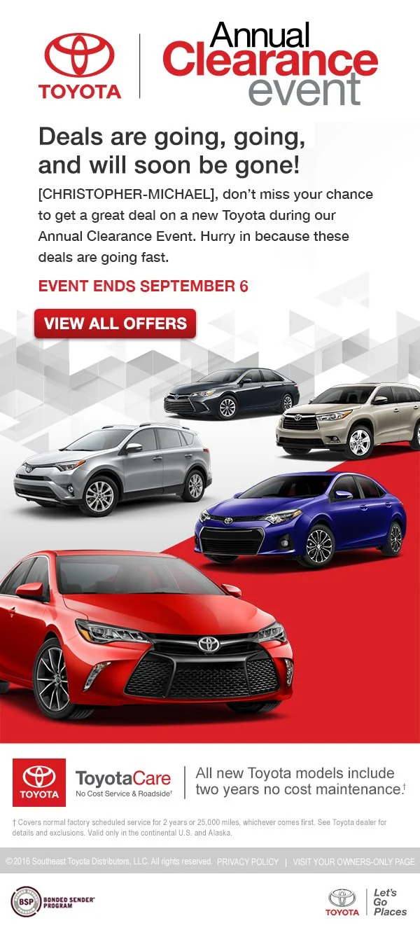 For over ten years, I have been involved with Southeast Toyota, starting with designing and animating print and digital deliverables for various vehicle promotions and annual sales events. During this time, I also created a logo for one of their dealer webinars. As I progressed in the agency, my role on the SET account transitioned to overseeing the digital design and animation work done by the Studio Department. While the Creative department came up with the campaign ideas, I remained involved in a hands-on capacity as needed, supporting the studio designers.